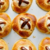 7. Just before baking, beat 1 egg with 1 tsp water then generously brush the bun and carefully brush the cross (the egg is prettier if it’s not splattered with egg wash). Bake at 375˚F in the center of the oven for 18-20 minutes (mine took 20 minutes for the eggs to fully cook through).